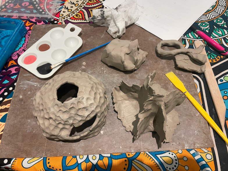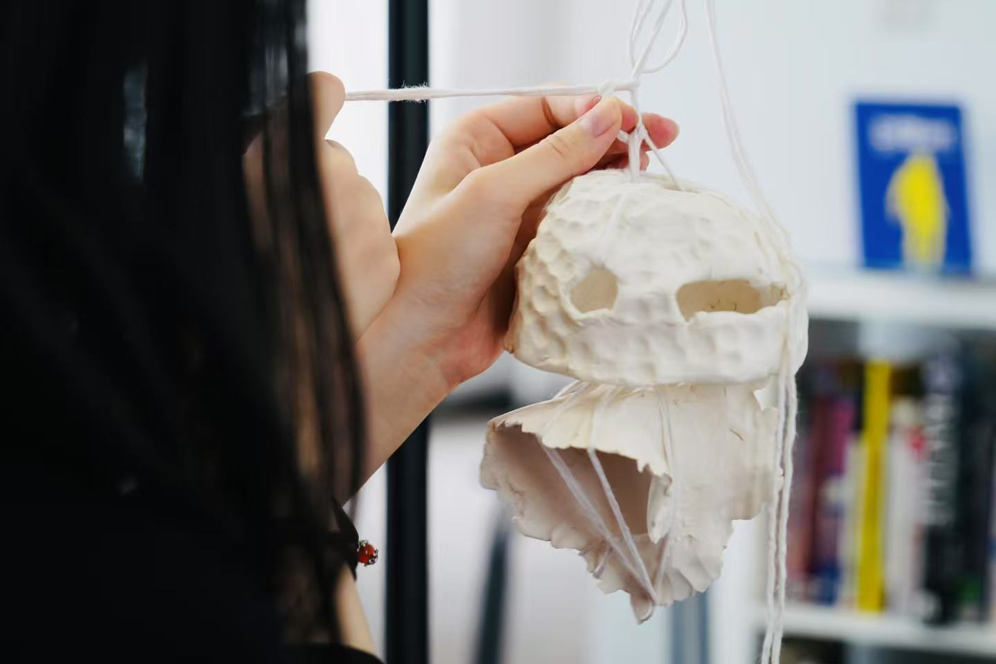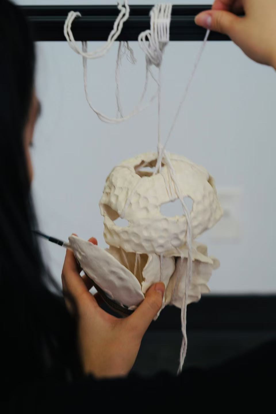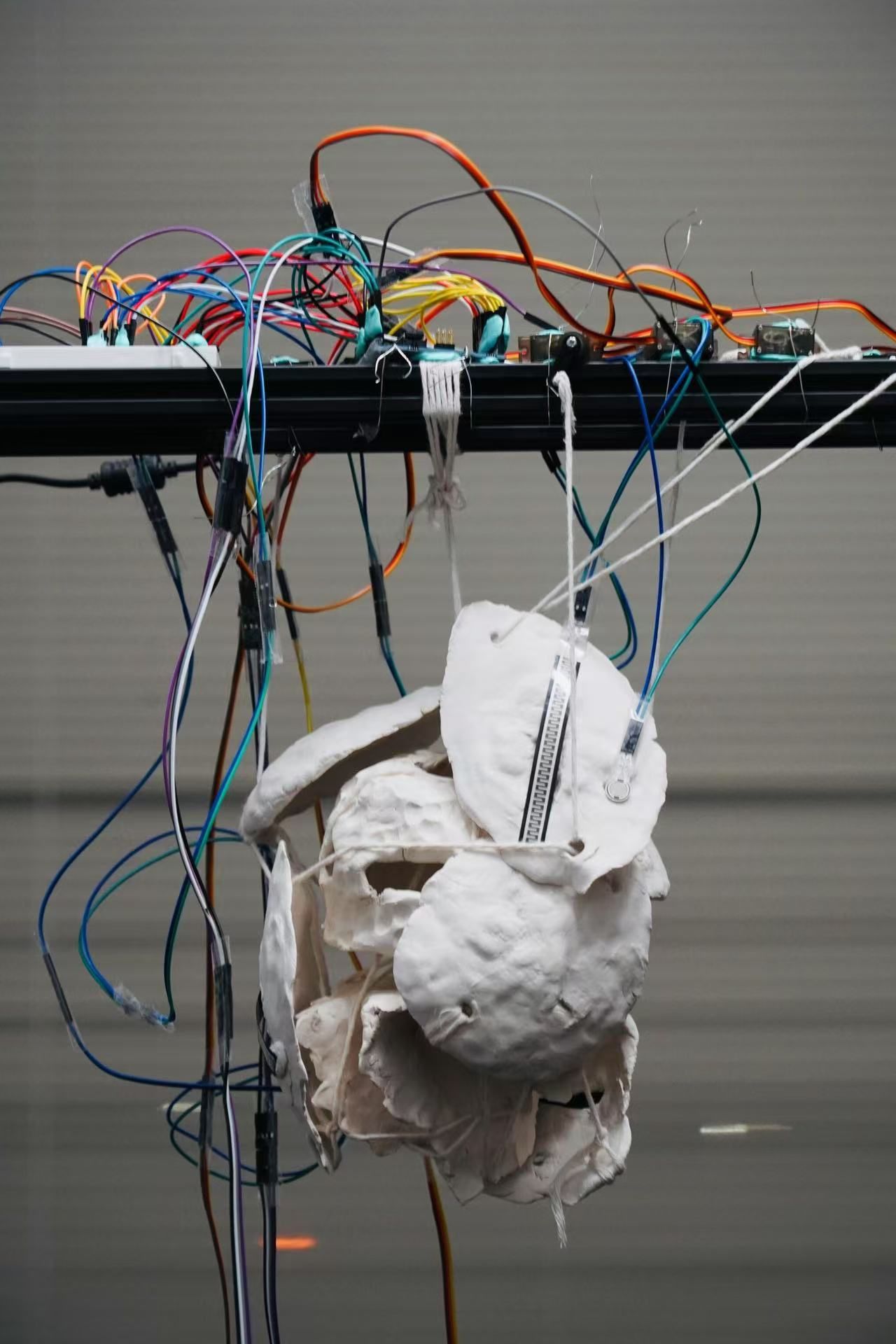 Several Patel-like Structures covering the fruit core. An irregular petal-like structure is composed of multiple irregular clay blocks connected by threads. A motor controls the threads’ tension, adjusting the angles and relative positions of the clay blocks to create deformation.