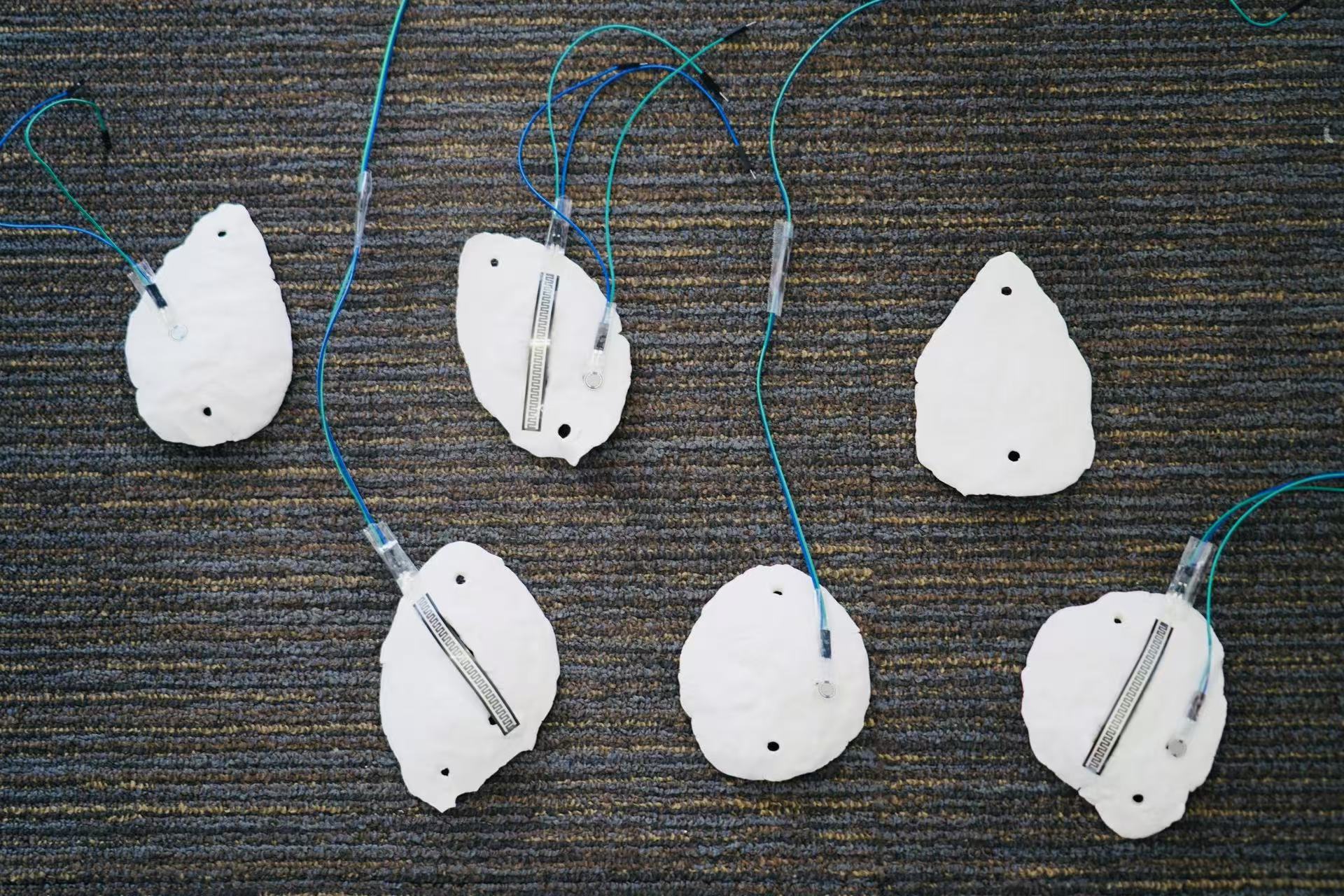 Multiple pressure sensors and flex sensors are attached to the surface of the fruit, monitoring the force applied on it. The fruit swings and trembles when being touched as if their scars are touched. What kind of scars? A strong desire to be cared not only physically, but emotionally. A strong desire to lead a decent late time. The trembling reflects their struggle in the caregiver relationship: having no choice but to depend on; having no autonomy but desiring love.